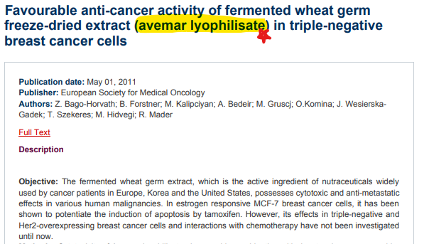 - Avemar 처리 시 특정 유방암 세포주에서 세포주기 정지(cell cycle arrest) 또는 세포 사멸(caspase 활성화 등)이 보고됨.